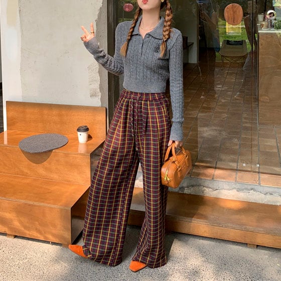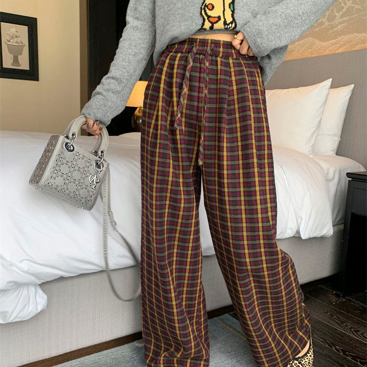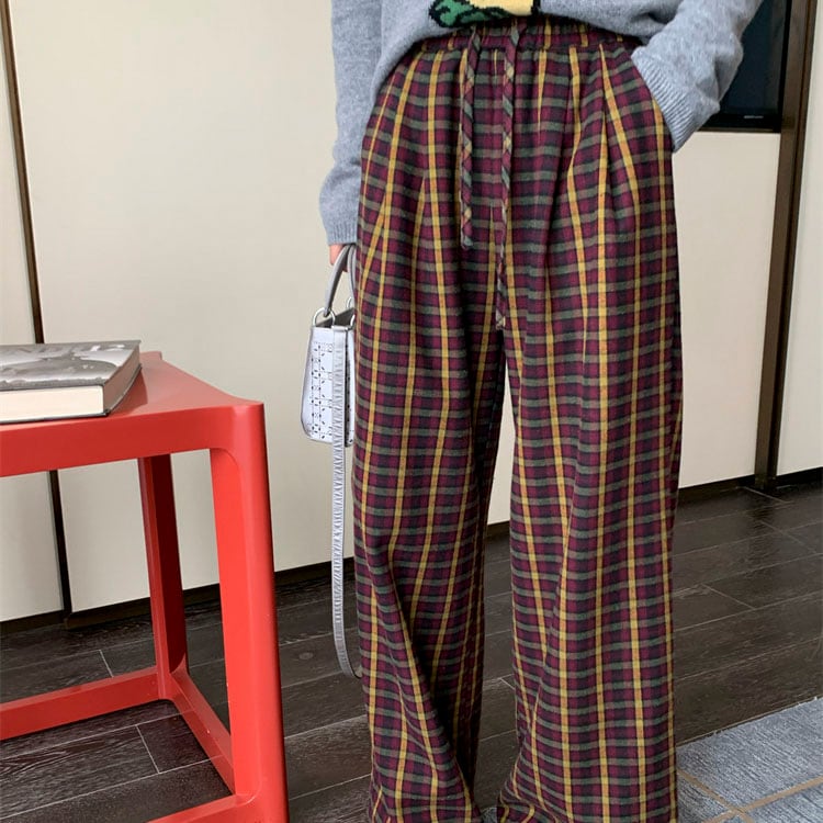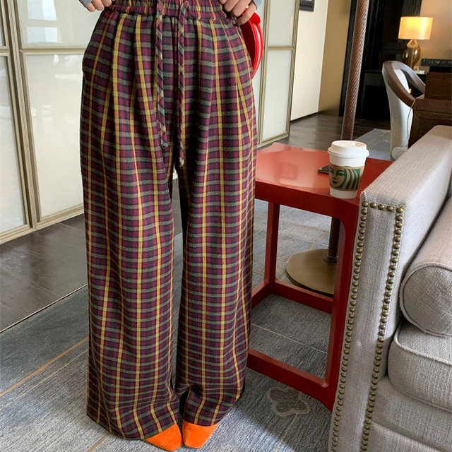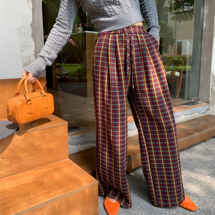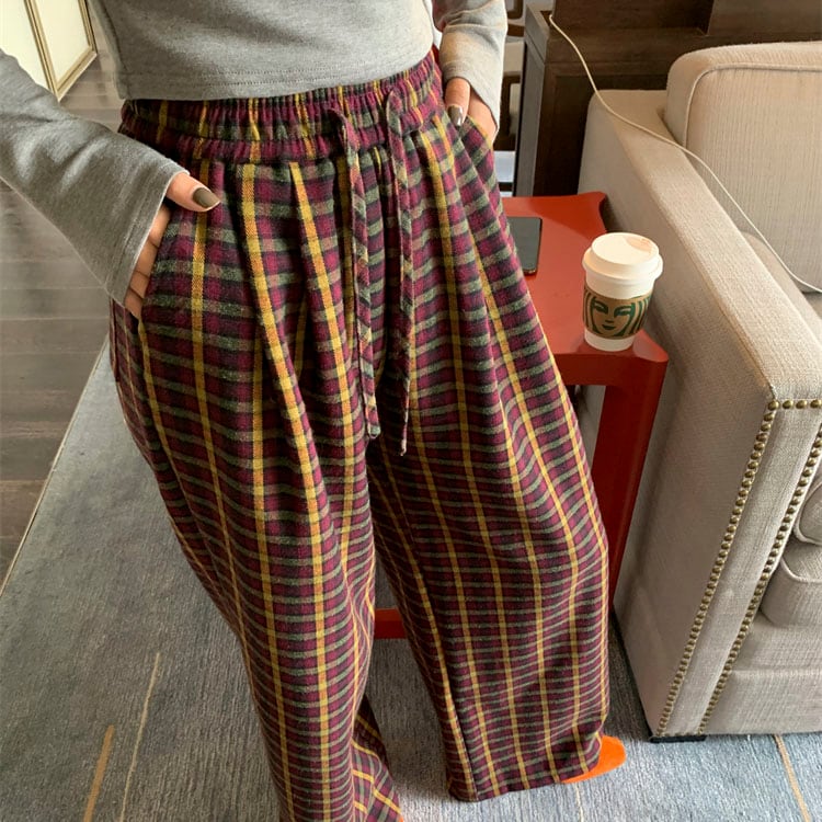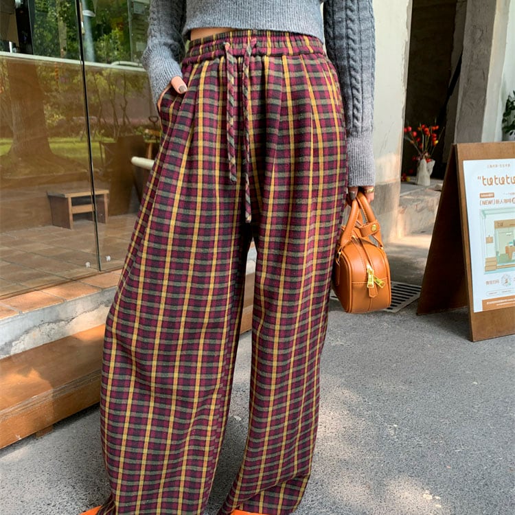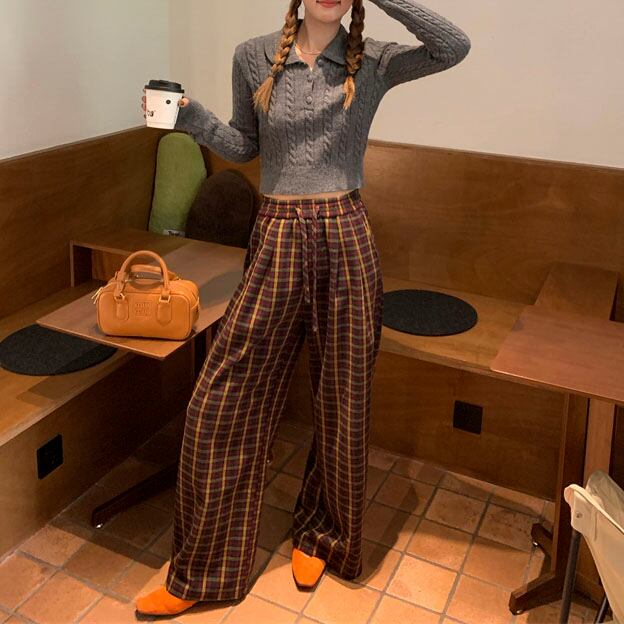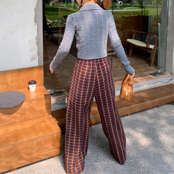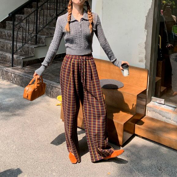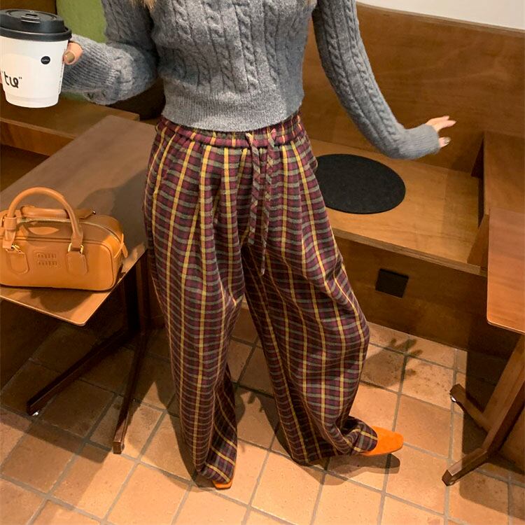 Checked wide-leg pants with a ribbon waist 2litr05564