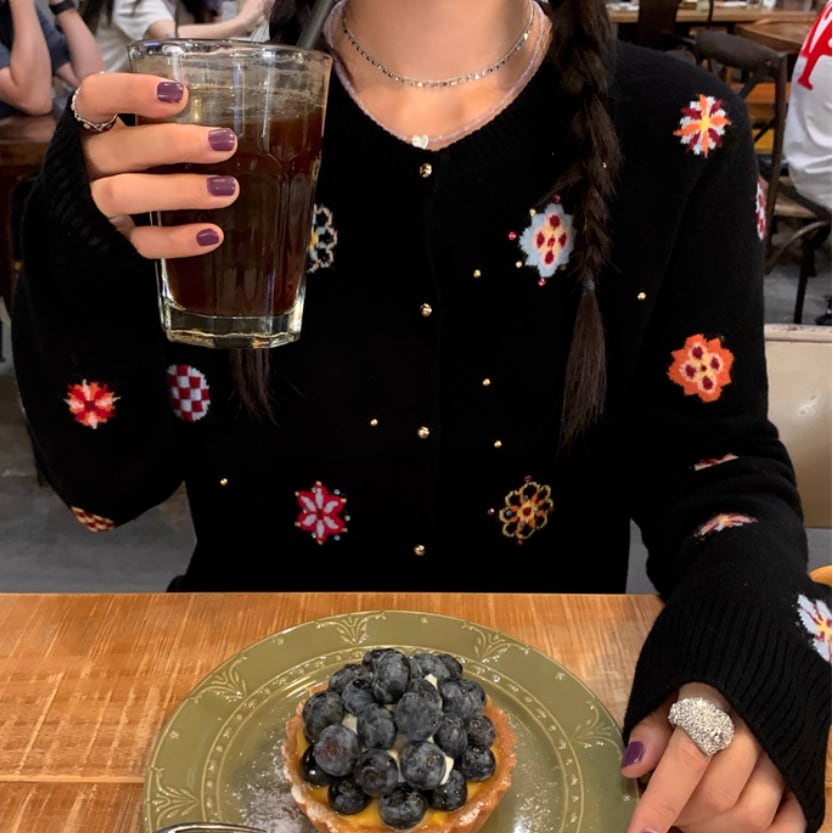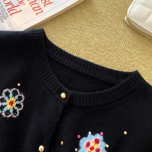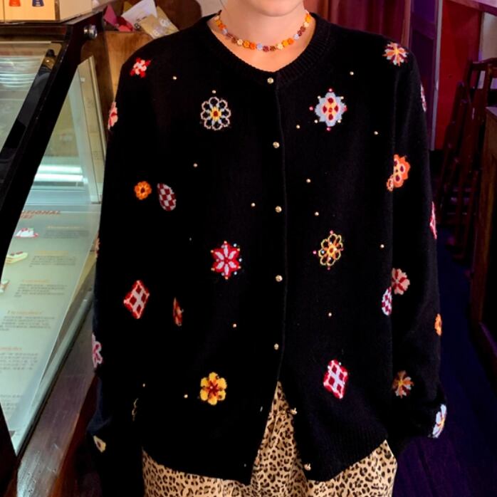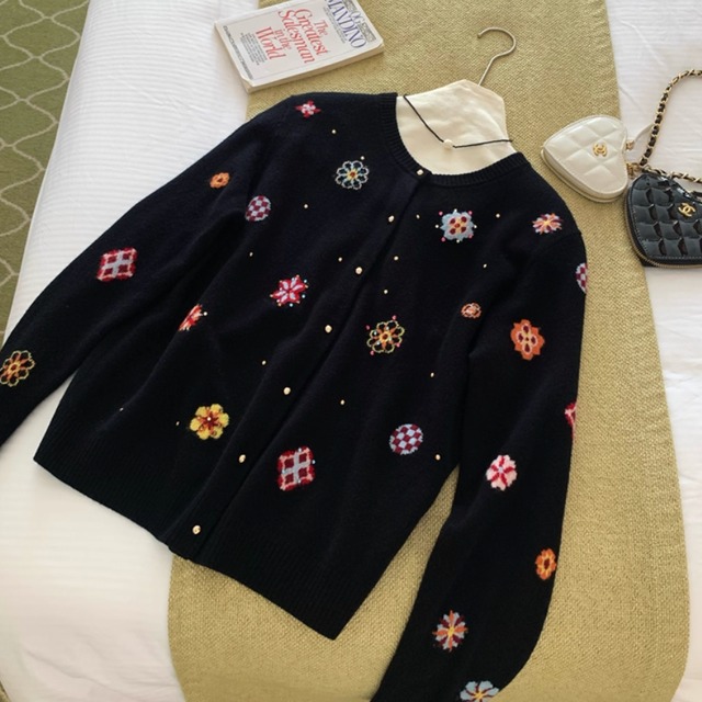 カラフルなフラワーモチーフが散りばめられた華やかなカーディガン。