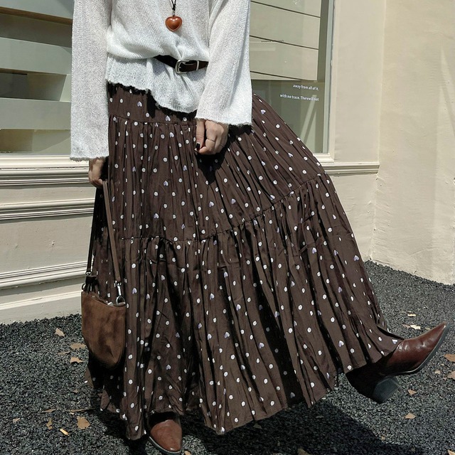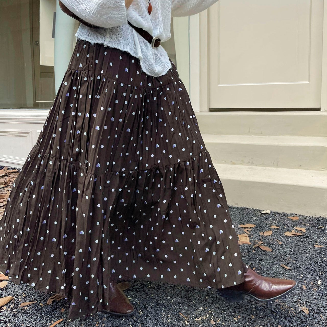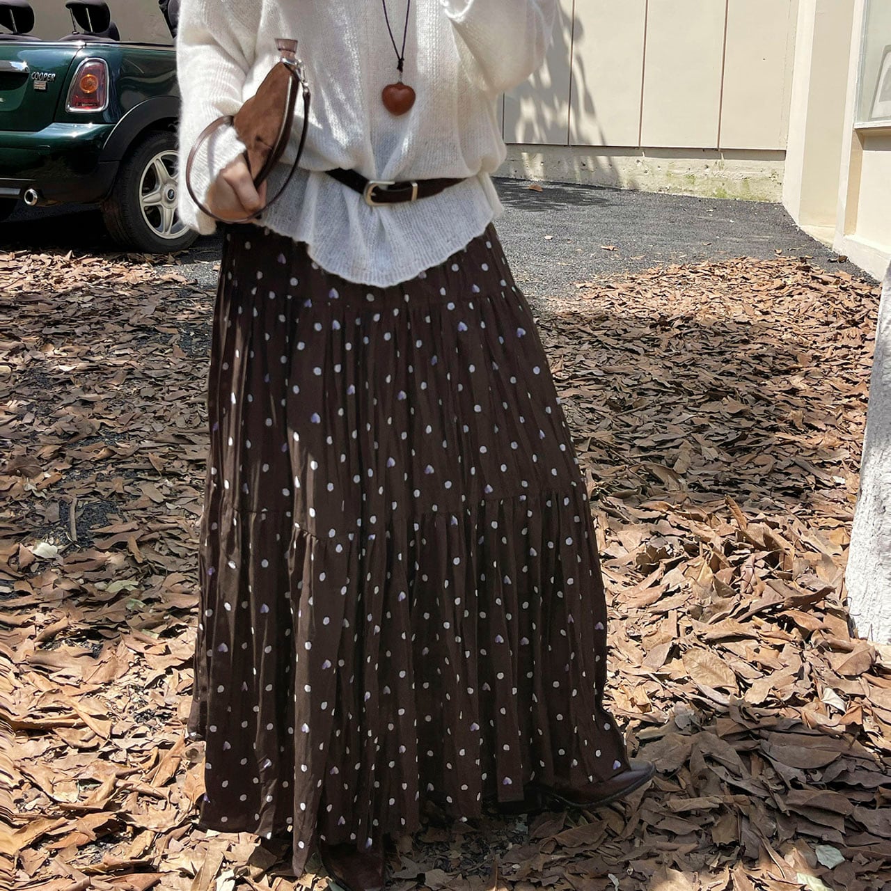 ブラウンベースに白ドットが映える大人可愛いプリーツスカート。