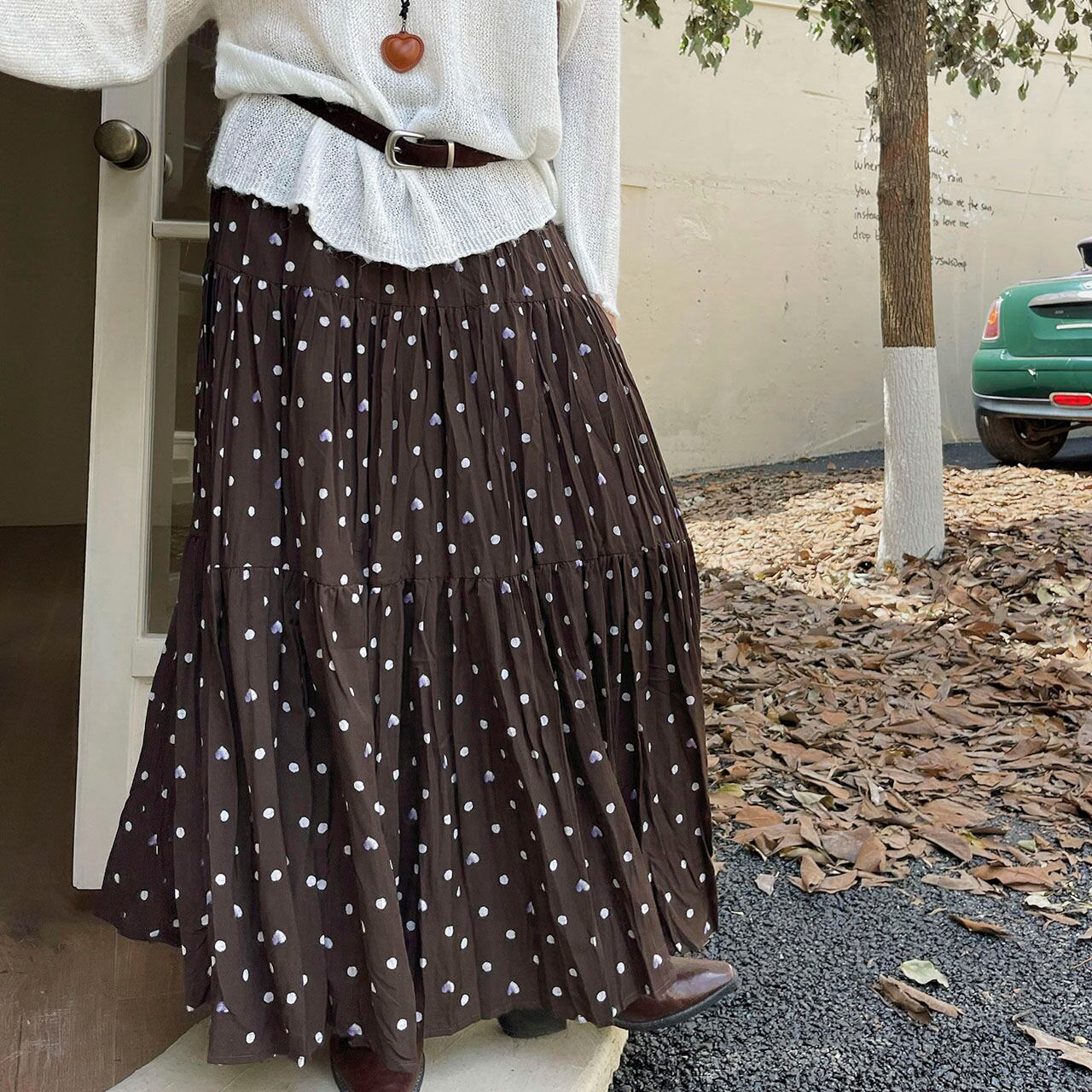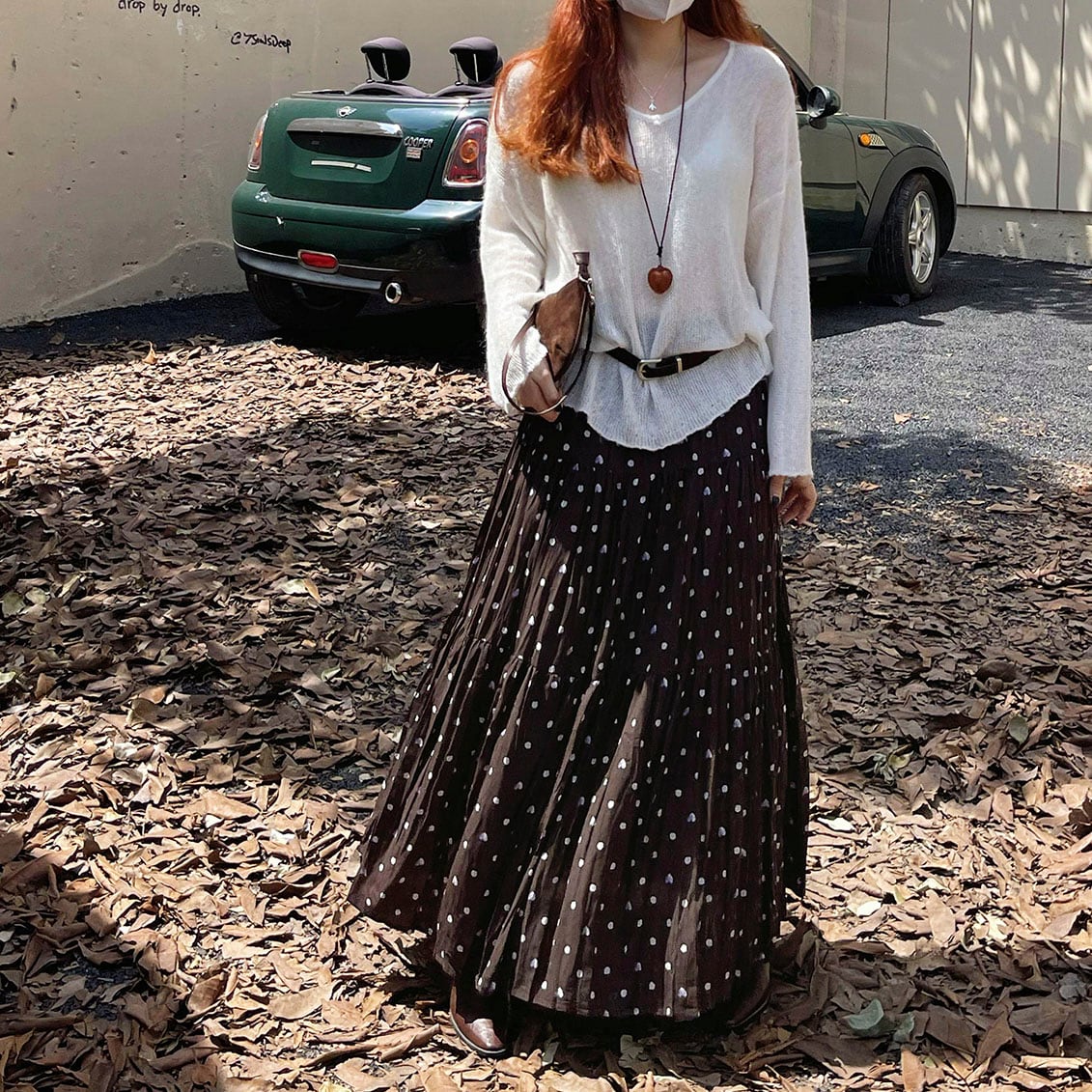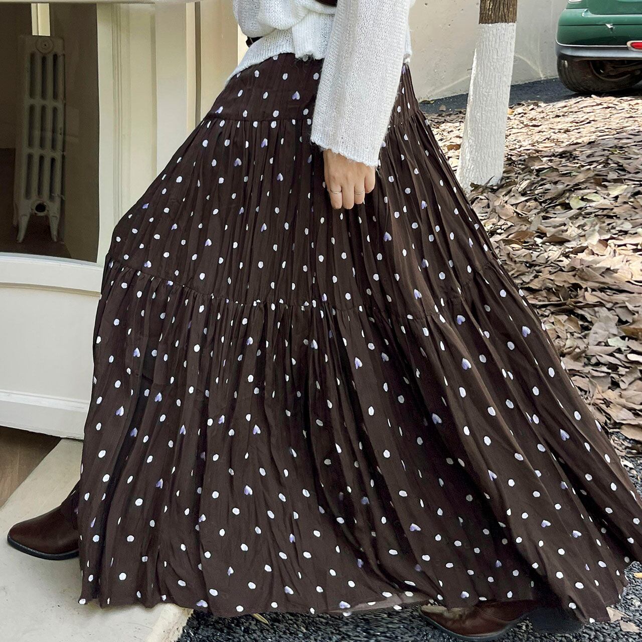 ブラウンベースに白ドットが映える大人可愛いプリーツスカート。