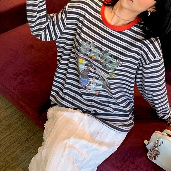 ボーダー柄と赤いネックラインがレトロなアクセントに◎