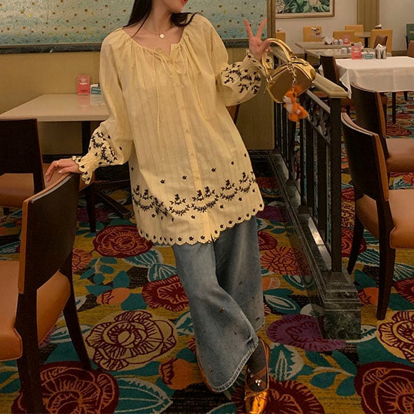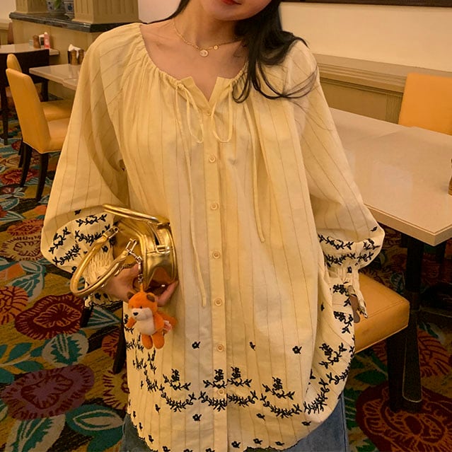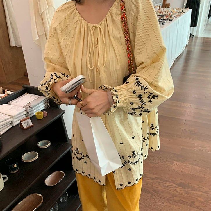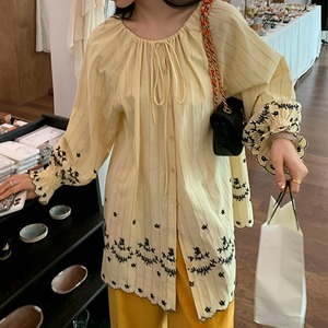 首元と袖口のリボンが可愛らしく、程よいボリュームスリーブが女性らしさを演出します。