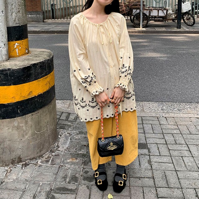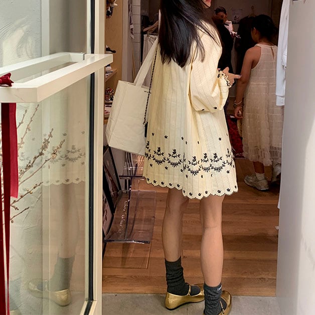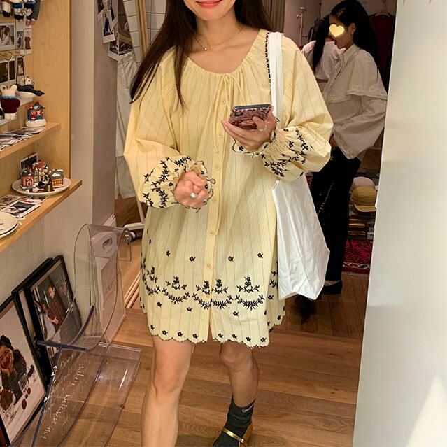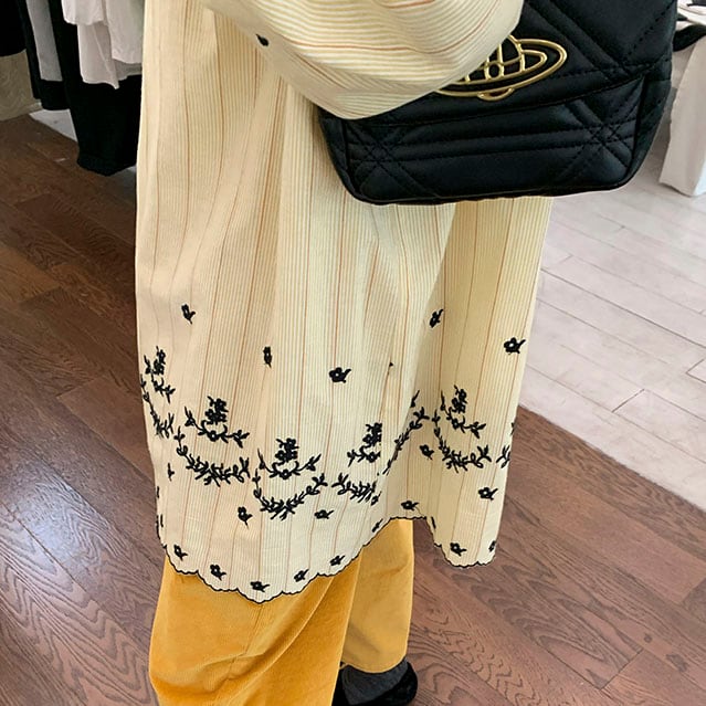 繊細なストライプに黒のフラワー刺繍が映えるクラシカルなワンピース♡
