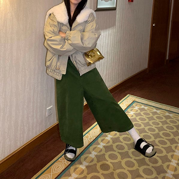 ふわっと軽く、あたたかい中綿入りで冬の外出も快適です。