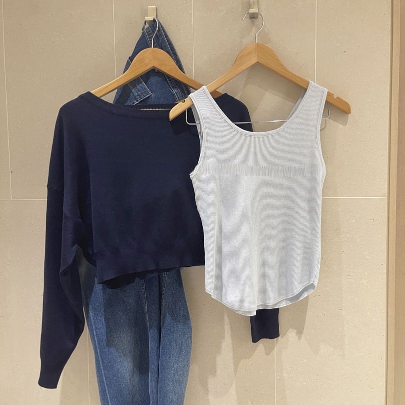 タンクはリブ素材で体にフィットし、重ねても単品でも使える優秀デザイン。