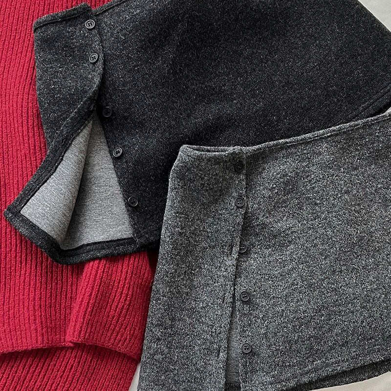 ウエストのボタン付きスカート風パーツが、こなれた雰囲気を演出。