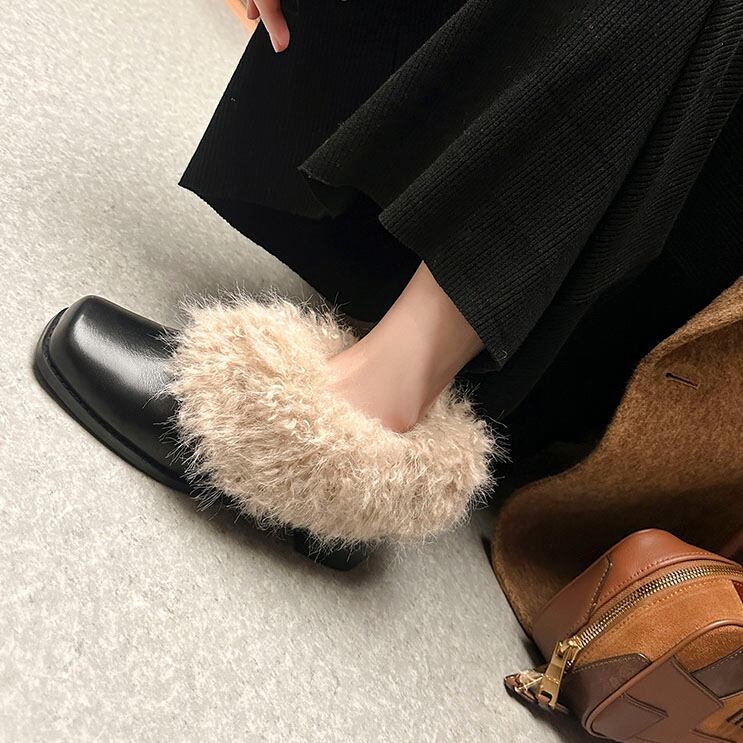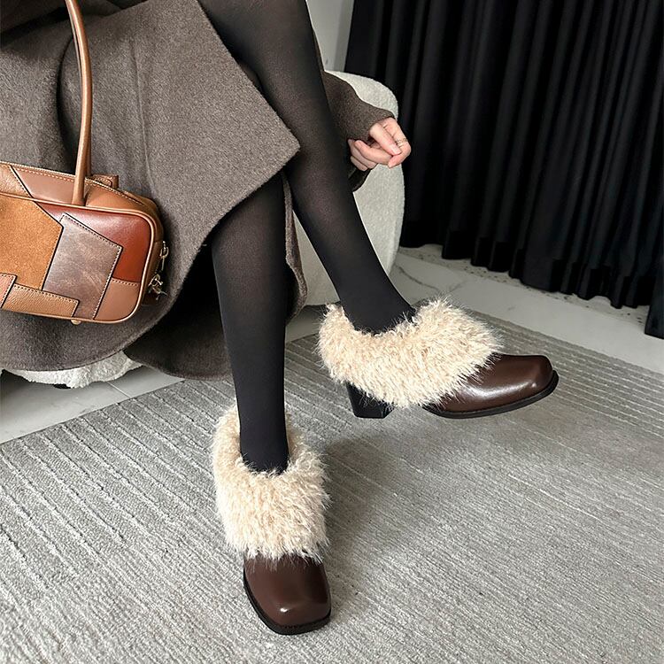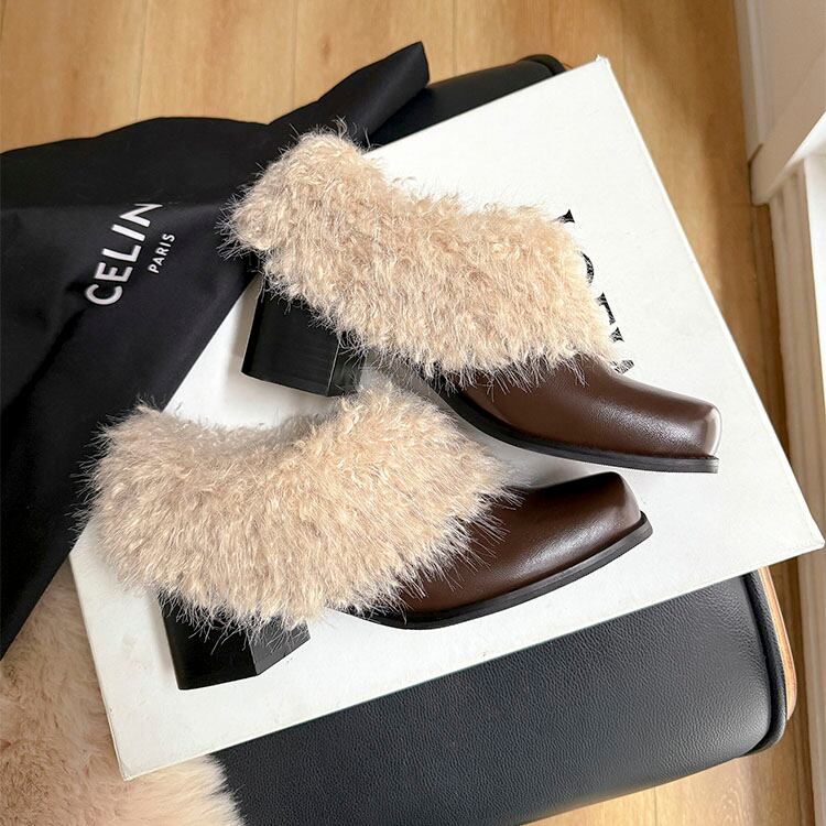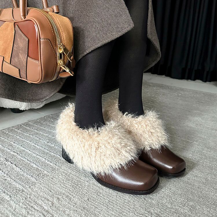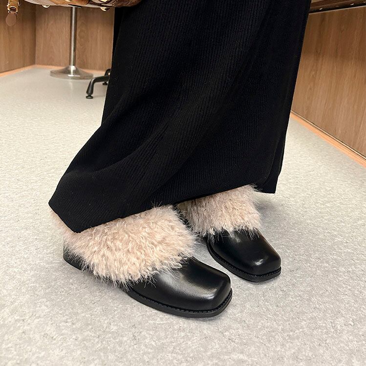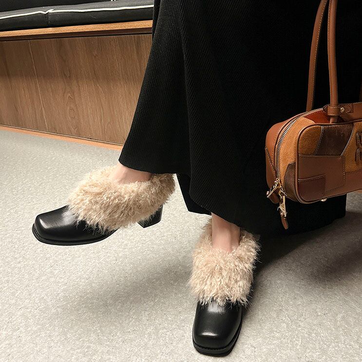 ふわりと柔らかなファーが足元を包み込むスクエアトゥのショートパンプスです♡