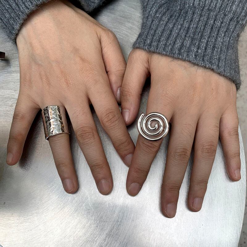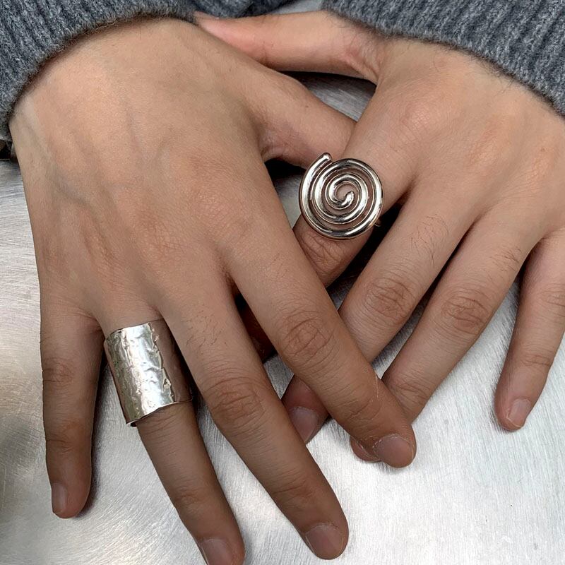 ぐるりと巻いたスパイラル型と、存在感のあるワイドカフ型から選べるメタルデザインリングです♡