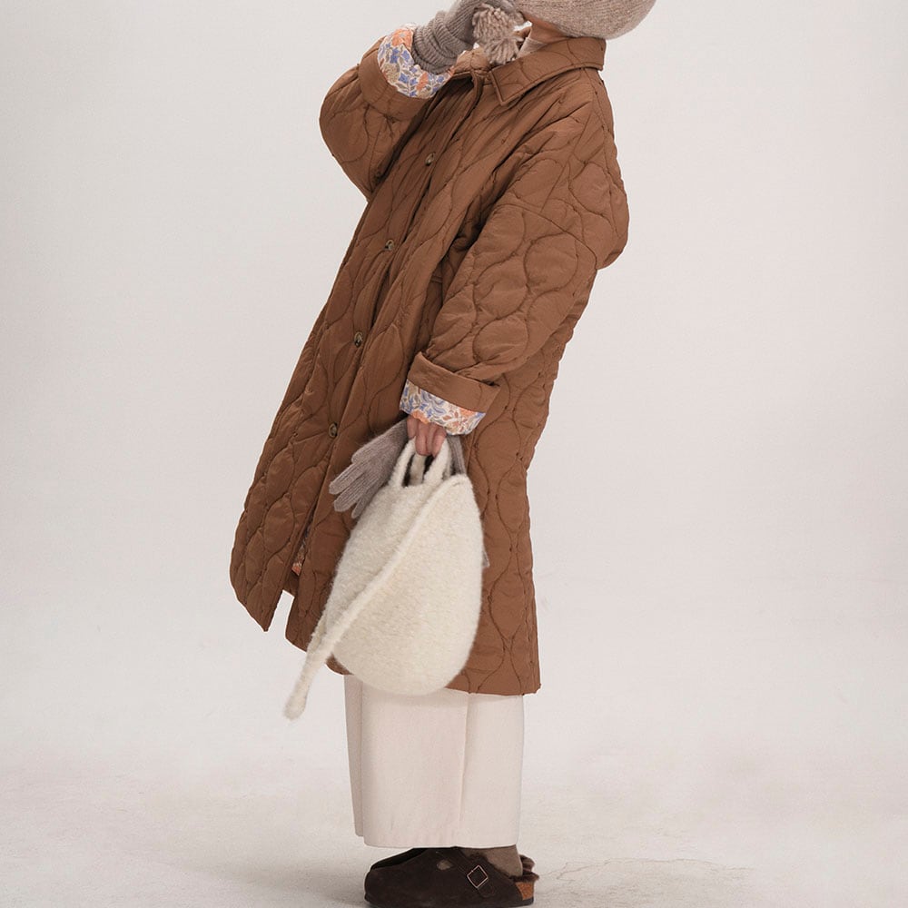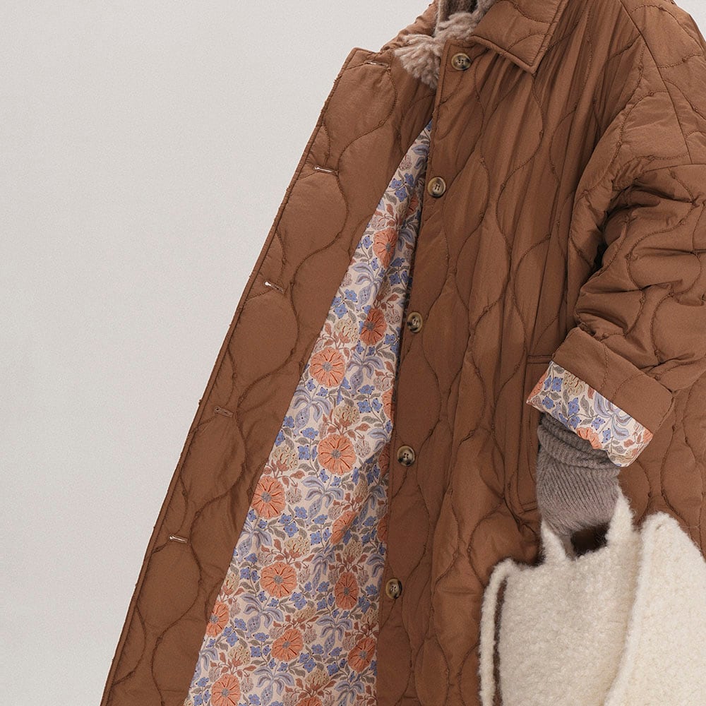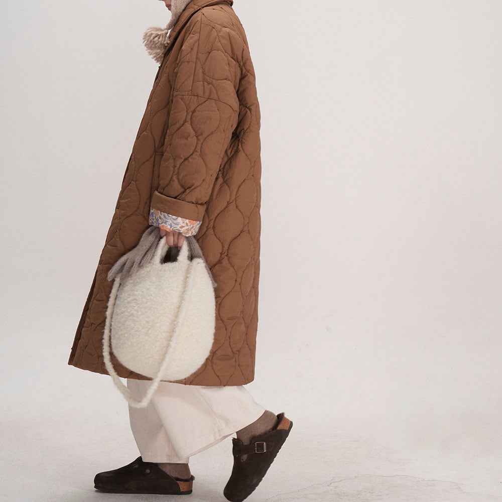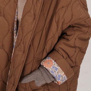 丸みのあるキルト模様がやさしい雰囲気を添え、裏地の花柄がチラッと覗いて冬の装いを華やかにします♡