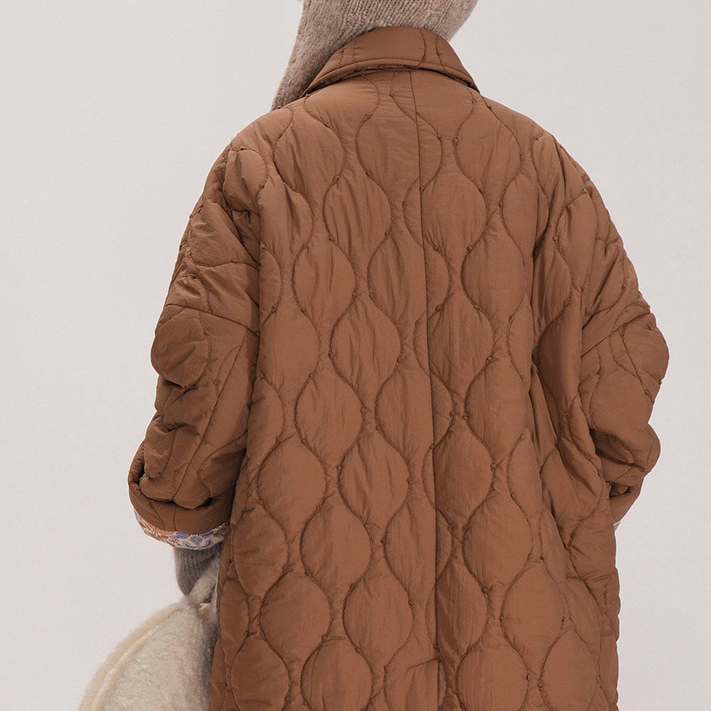 ゆったりめのシルエットで厚手ニットの上からもラクに重ねられ、ロング丈が全身を包み込むようにあたためてくれます。