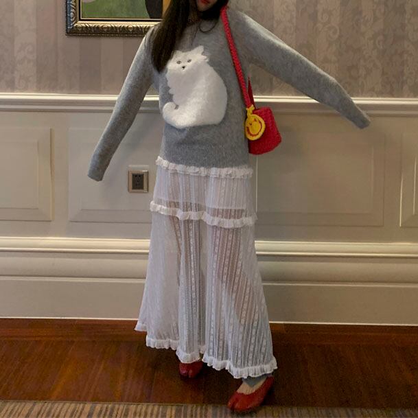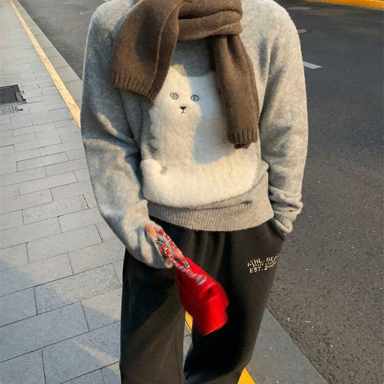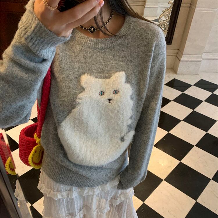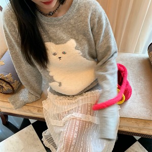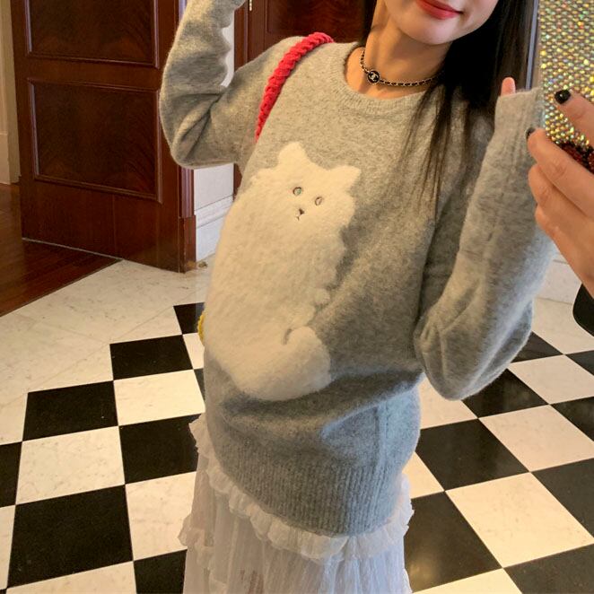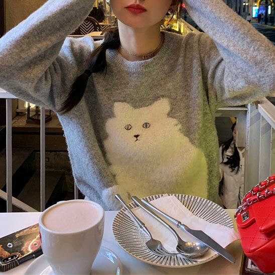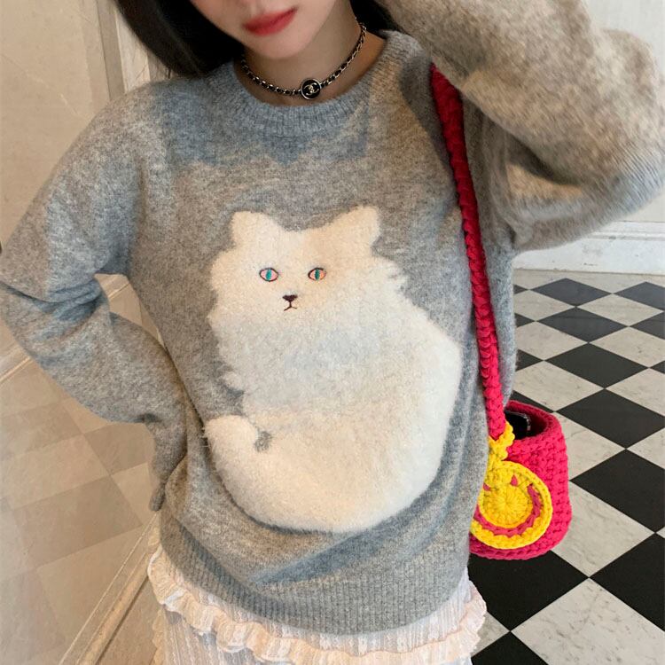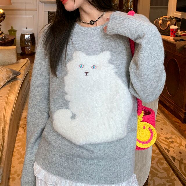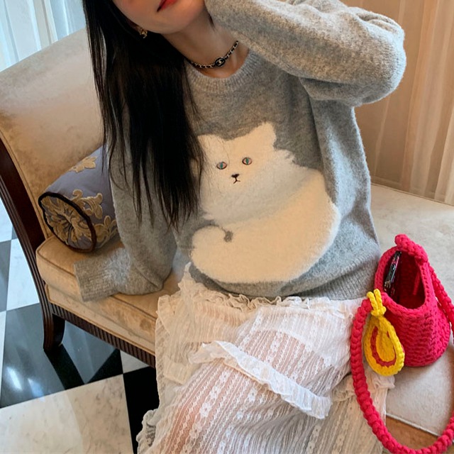 ふわふわ猫モチーフが愛らしい、一枚で主役になるニットです。