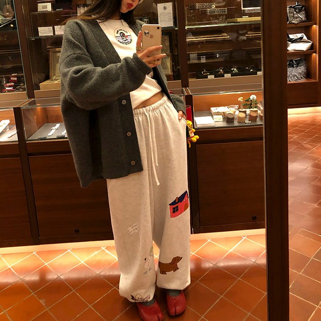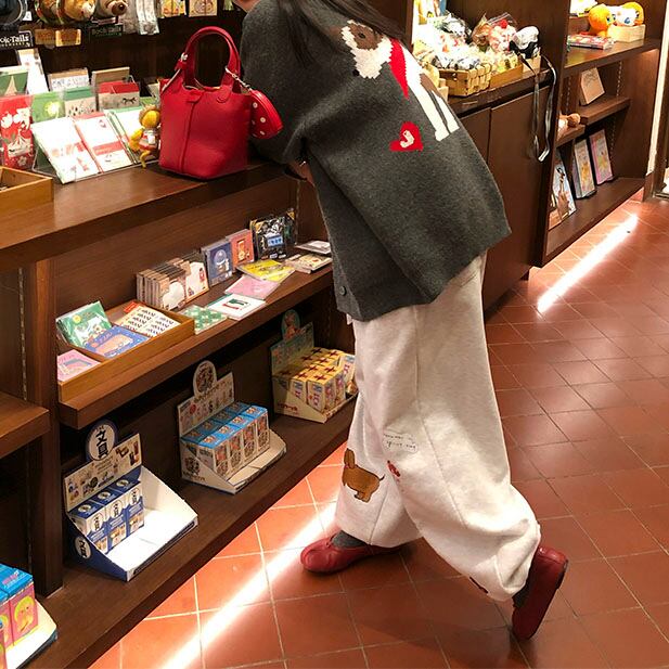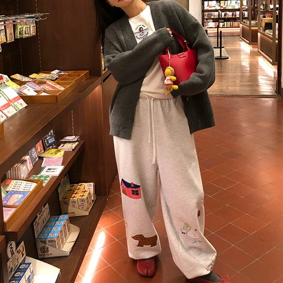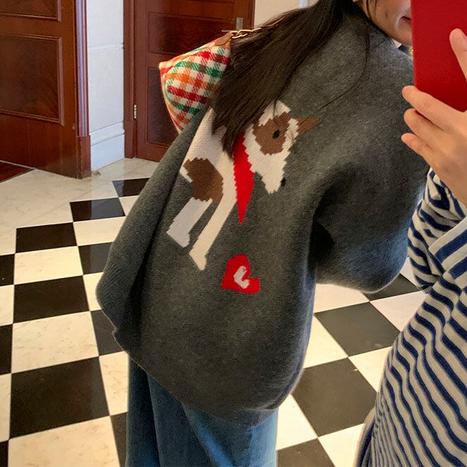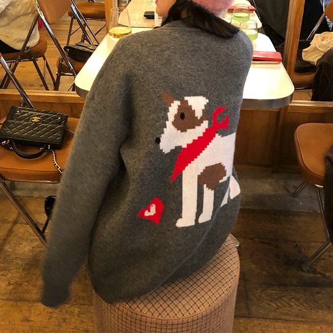 背中に施した犬のジャカード柄が、コーデの主役になるカーディガンです。