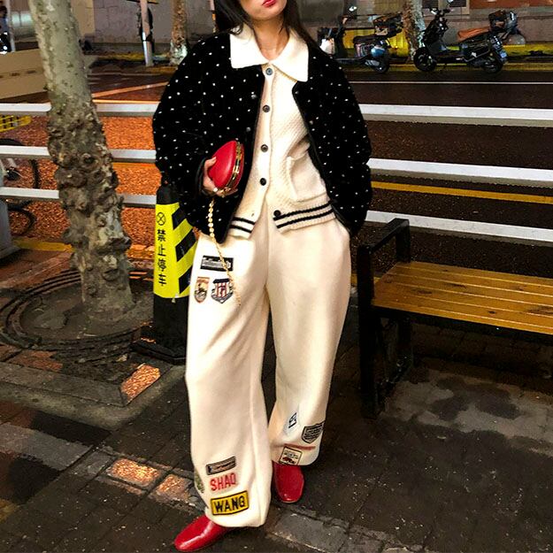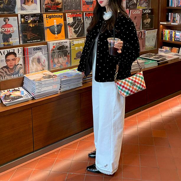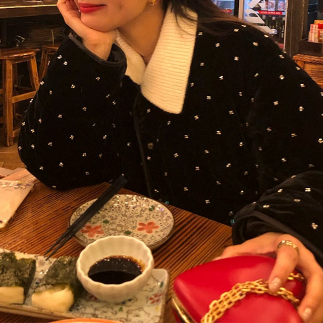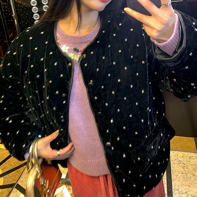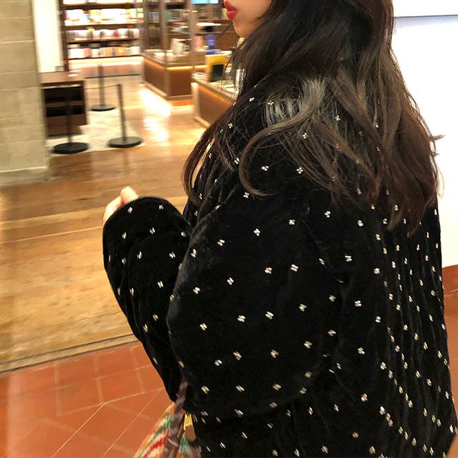 上品な光沢のあるベルベット素材に、小さなビーズを小花のように散りばめたショートジャケットです♡