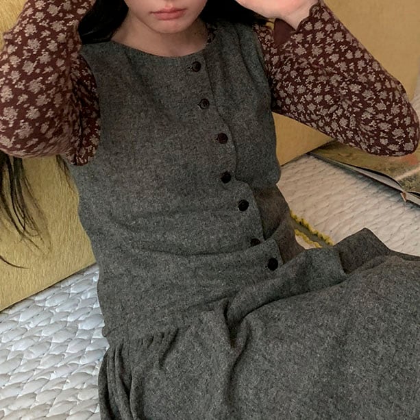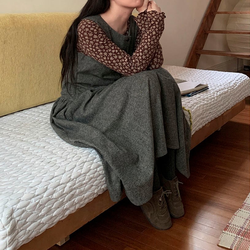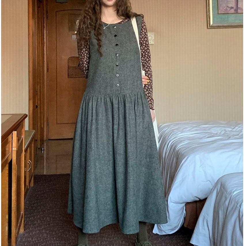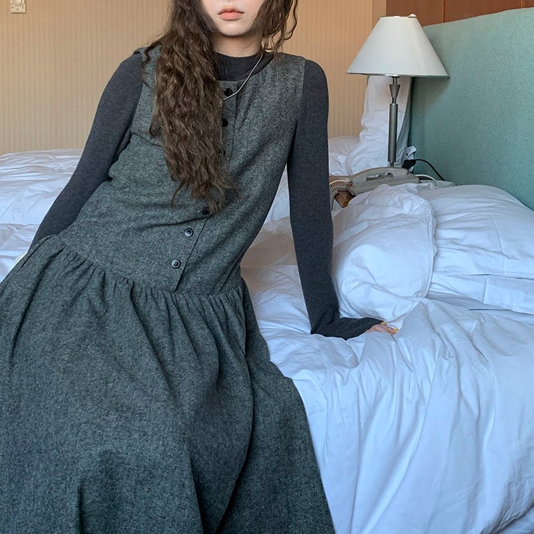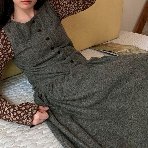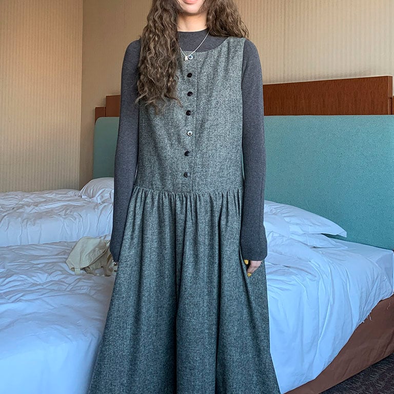 落ち着いたウール調素材が大人っぽく、重ね着を楽しめるノースリーブワンピースです。