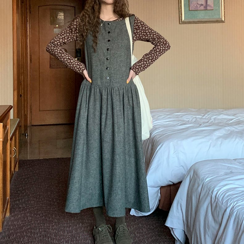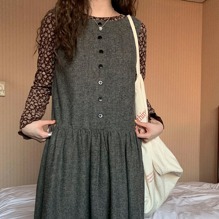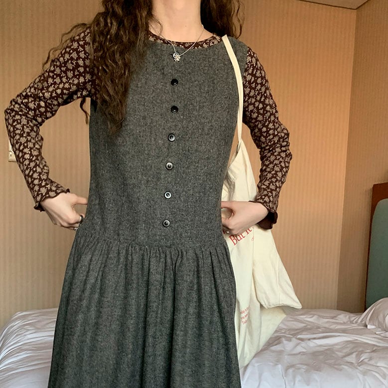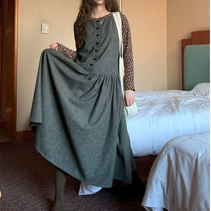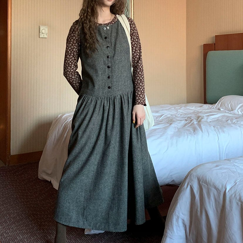 落ち着いたウール調素材が大人っぽく、重ね着を楽しめるノースリーブワンピースです。