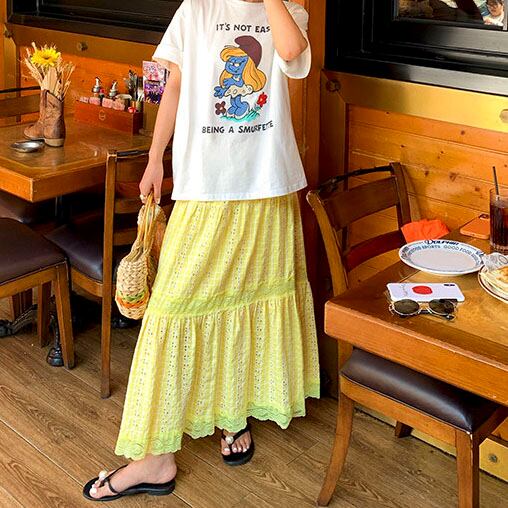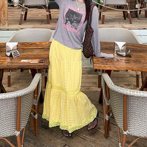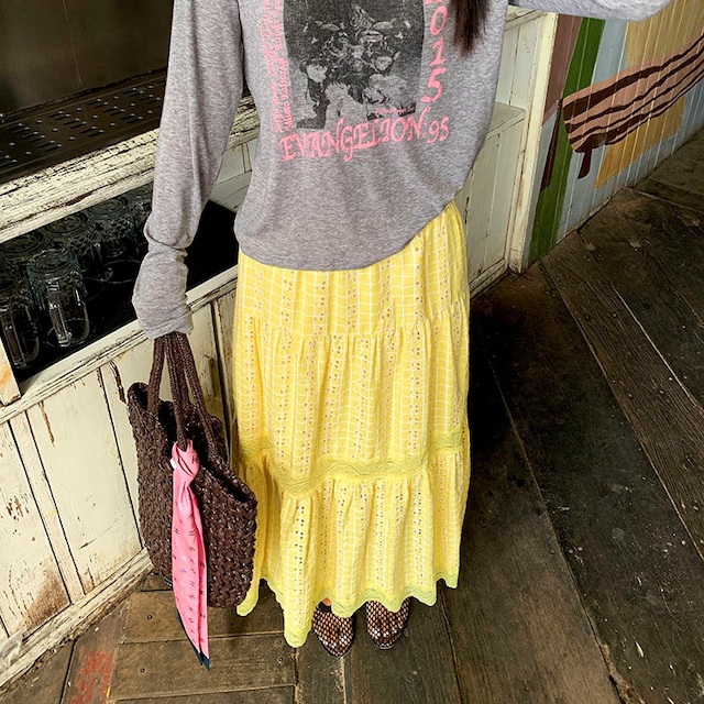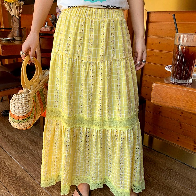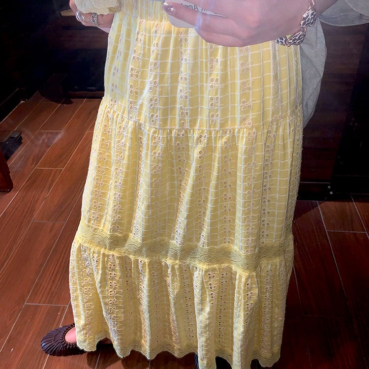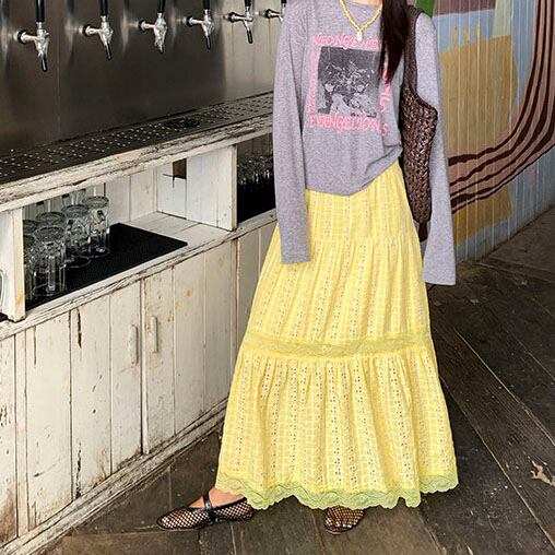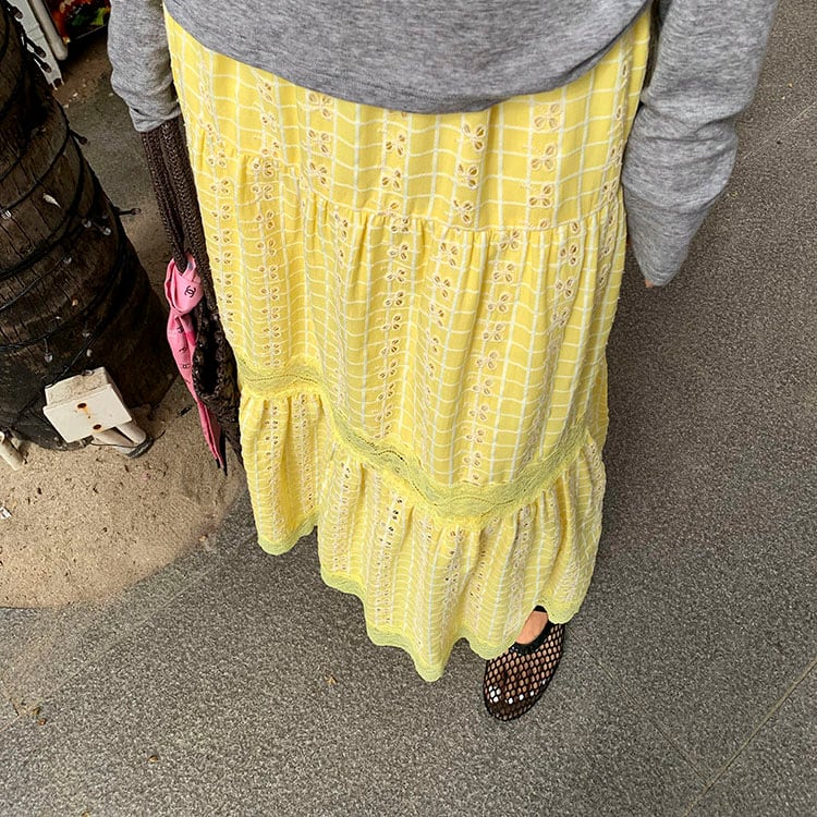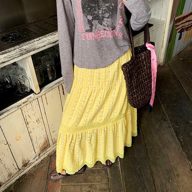 爽やかなイエローチェックに小花モチーフが映えるロングスカート!
