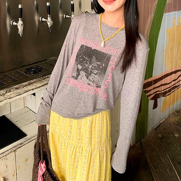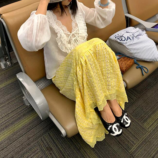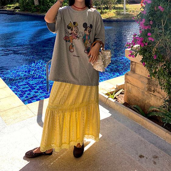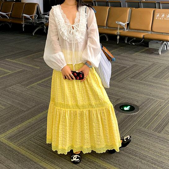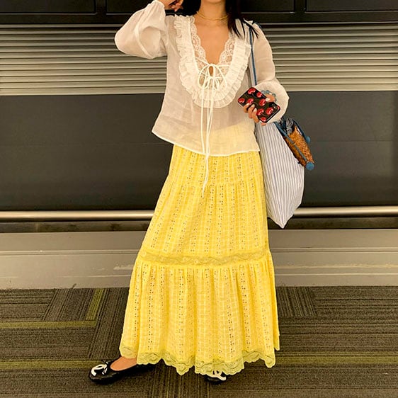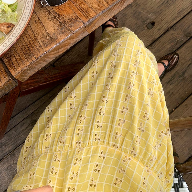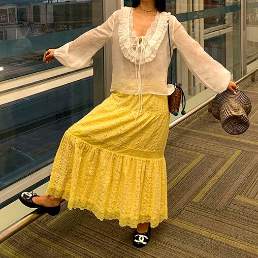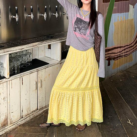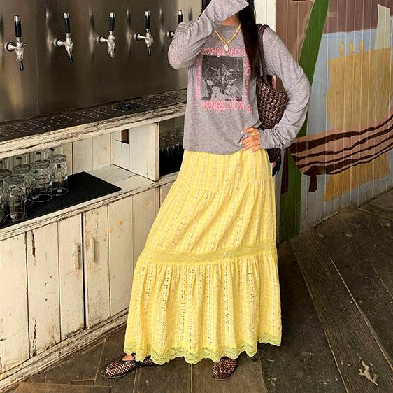 爽やかなイエローチェックに小花モチーフが映えるロングスカート!