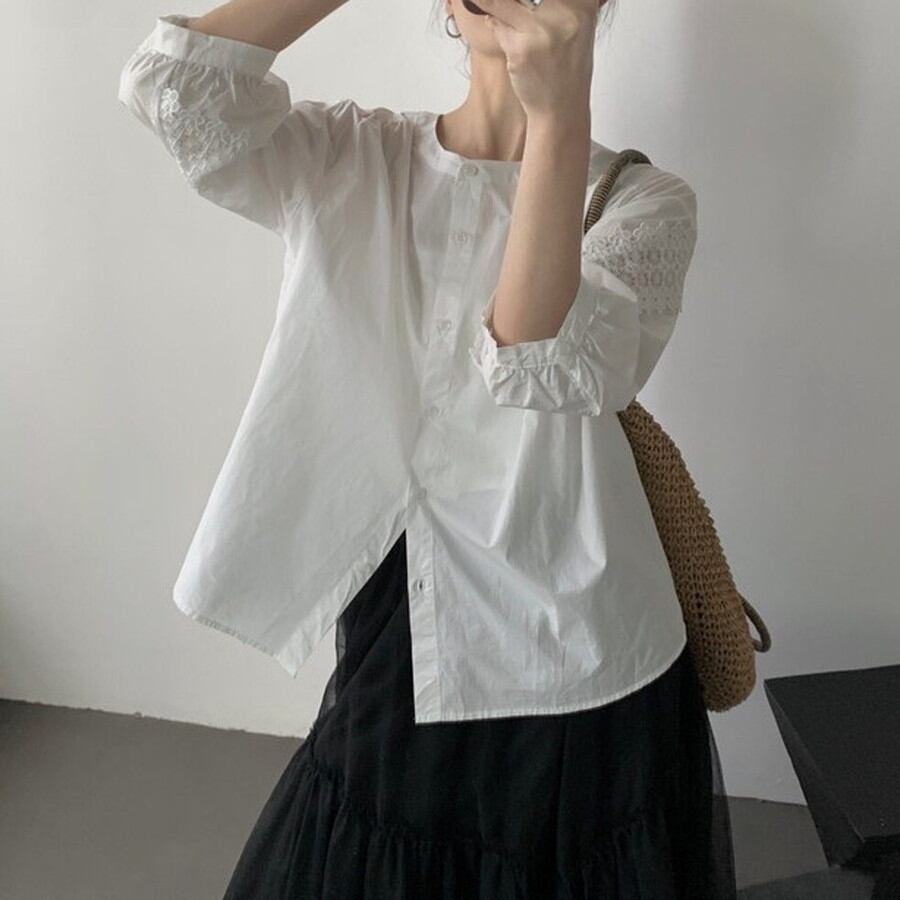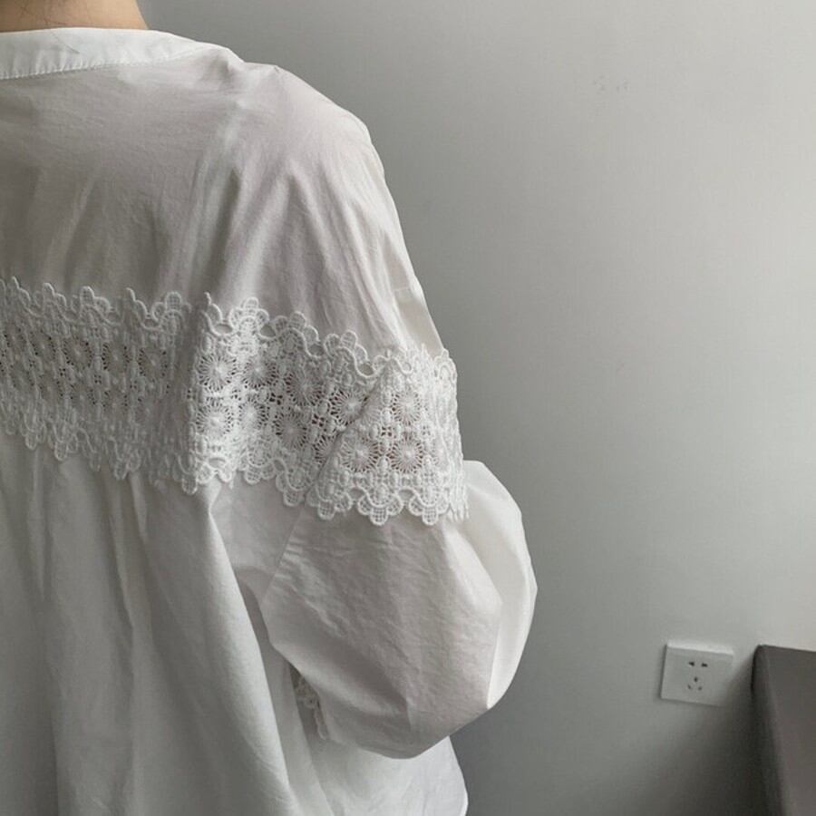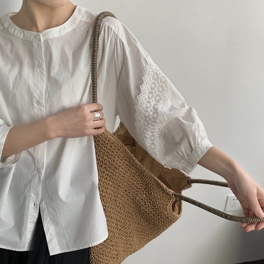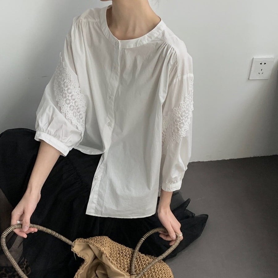 flower openwork band-collar balloon-sleeve blouse 2litr06308