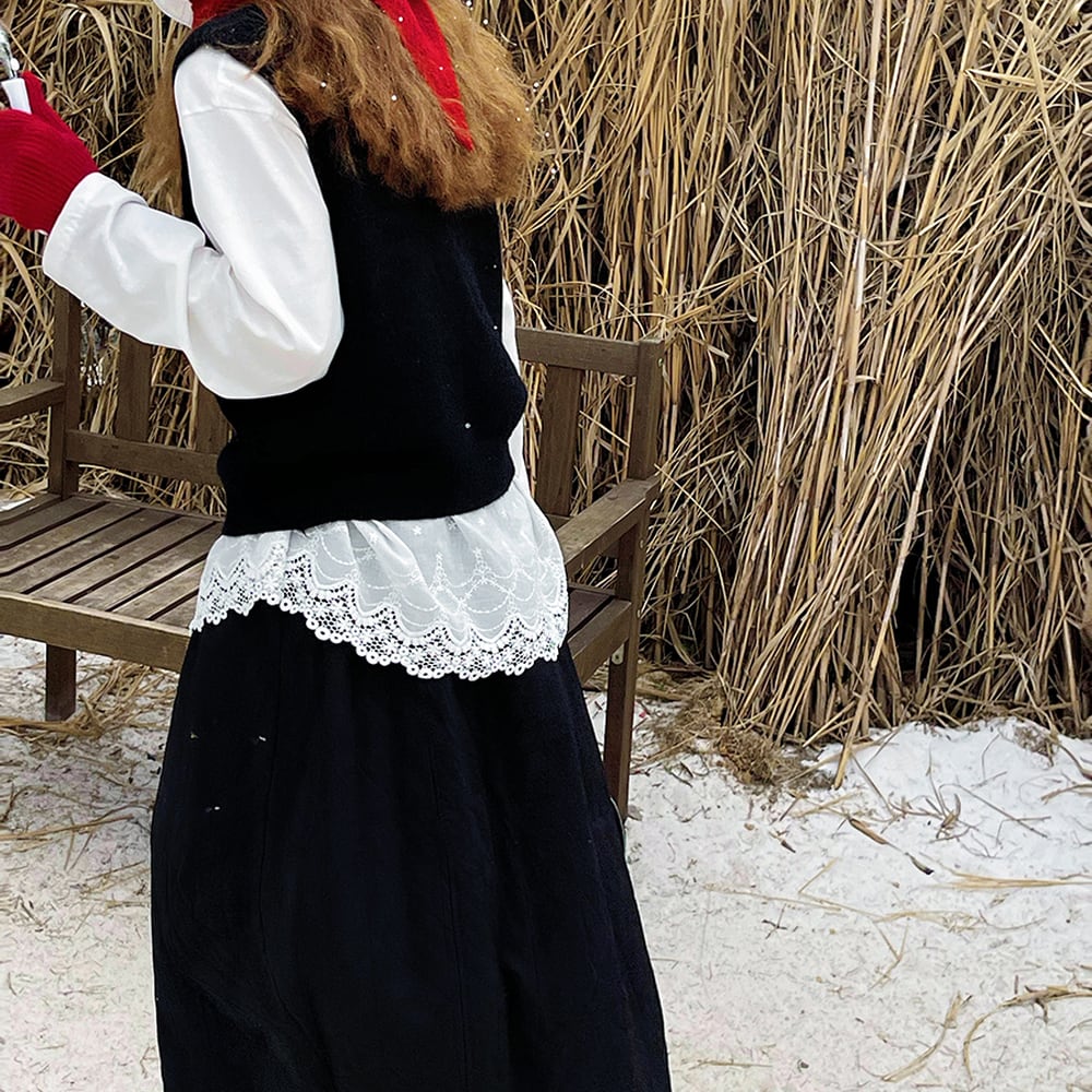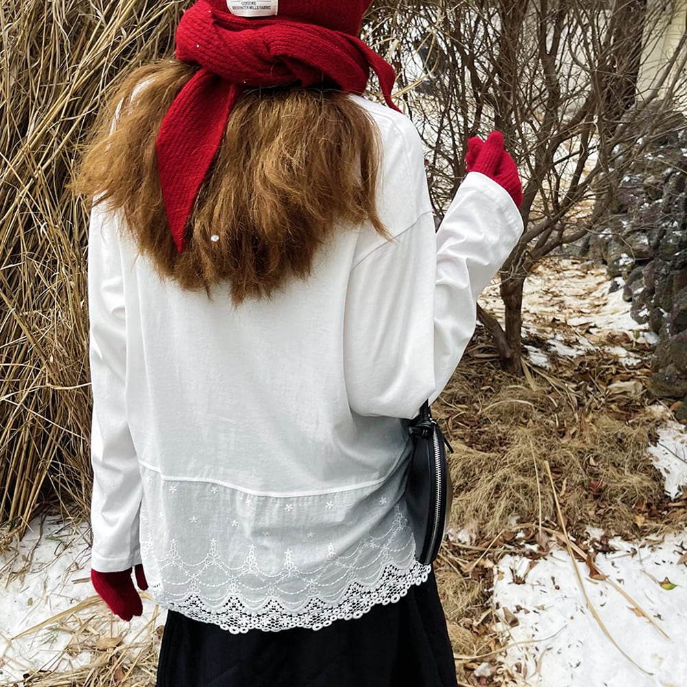 レイヤードスタイルで自信が持てるレースロングカットソー