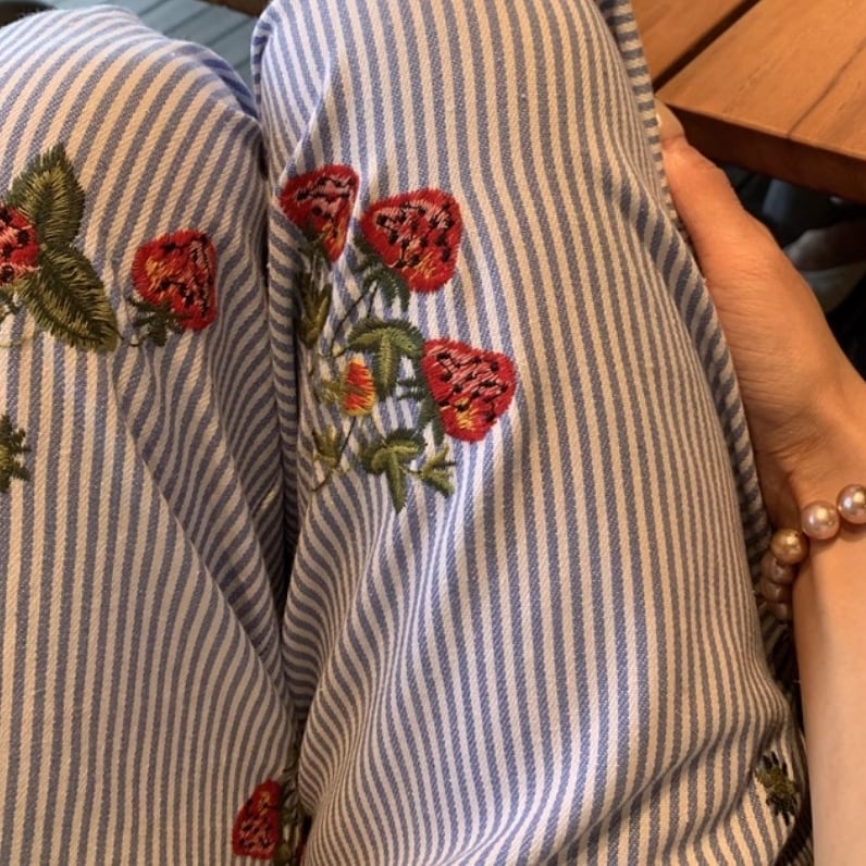 ブルーとホワイトのストライプで柔らかな印象のパンツ。